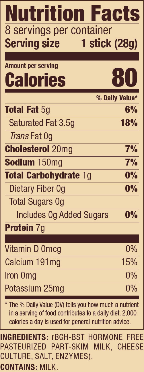 Convenient and easy to take just about anywhere, our mozzarella string cheese is perfect for lunch boxes, after school or in the office. Best of all, this grab and go treat is fun to eat, has 7g of protein and only 80 calories per stick.