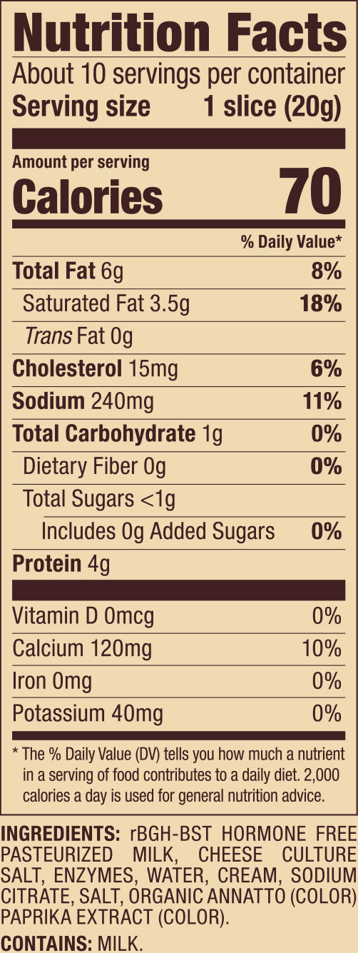 Yellow American Sliced Grilled cheese? Juicy burger? American cheese me! The all-family favorite, our American cheese is a delicious proprietary blend of aged cheddar and Monterey jack cheese. Nutrition Facts (click to enlarge) (click to enlarge)